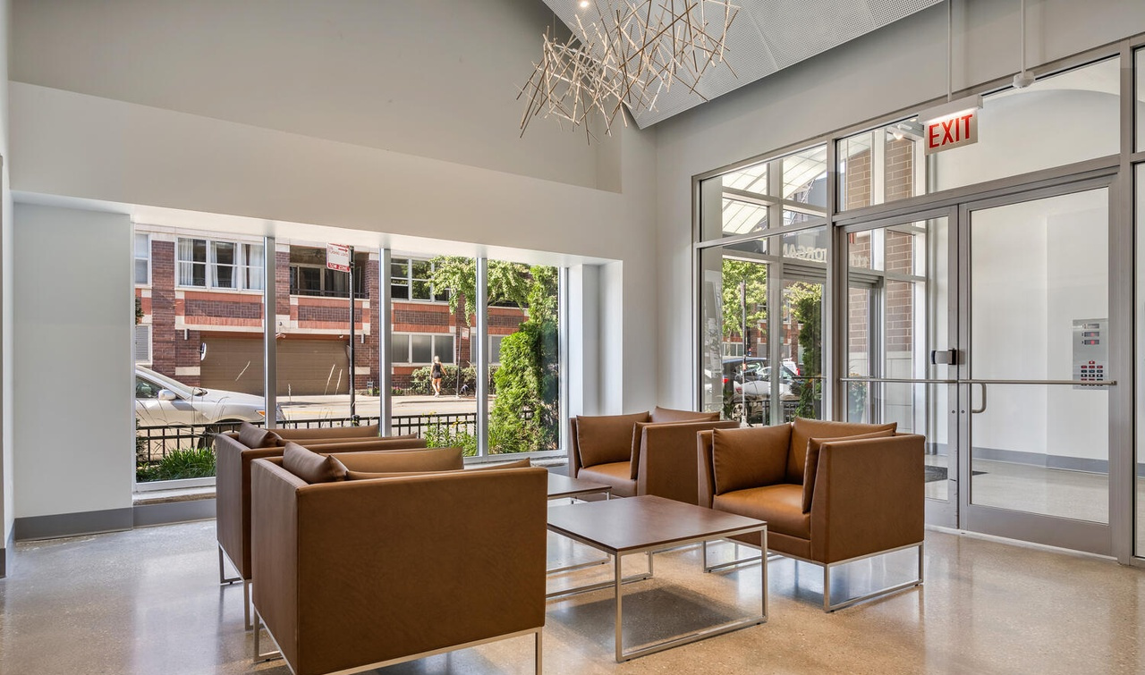 The lobby and corridor at 111 S Morgan was redesigned with a focus on modern comfort and efficiency. Sleek flooring, custom millwork, and statement lighting are complemented by warm tones and greenery that create a welcoming, residential feel.