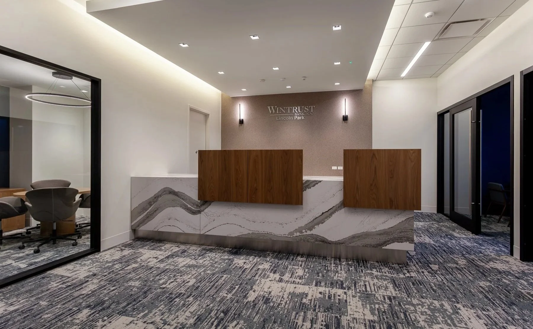 Wintrust Bank’s Lincoln Park branch introduces a modern, refined space. Marble countertops, custom millwork, and an open layout create a bright, functional environment. The design balances contemporary finishes with the neighborhood’s historic character.