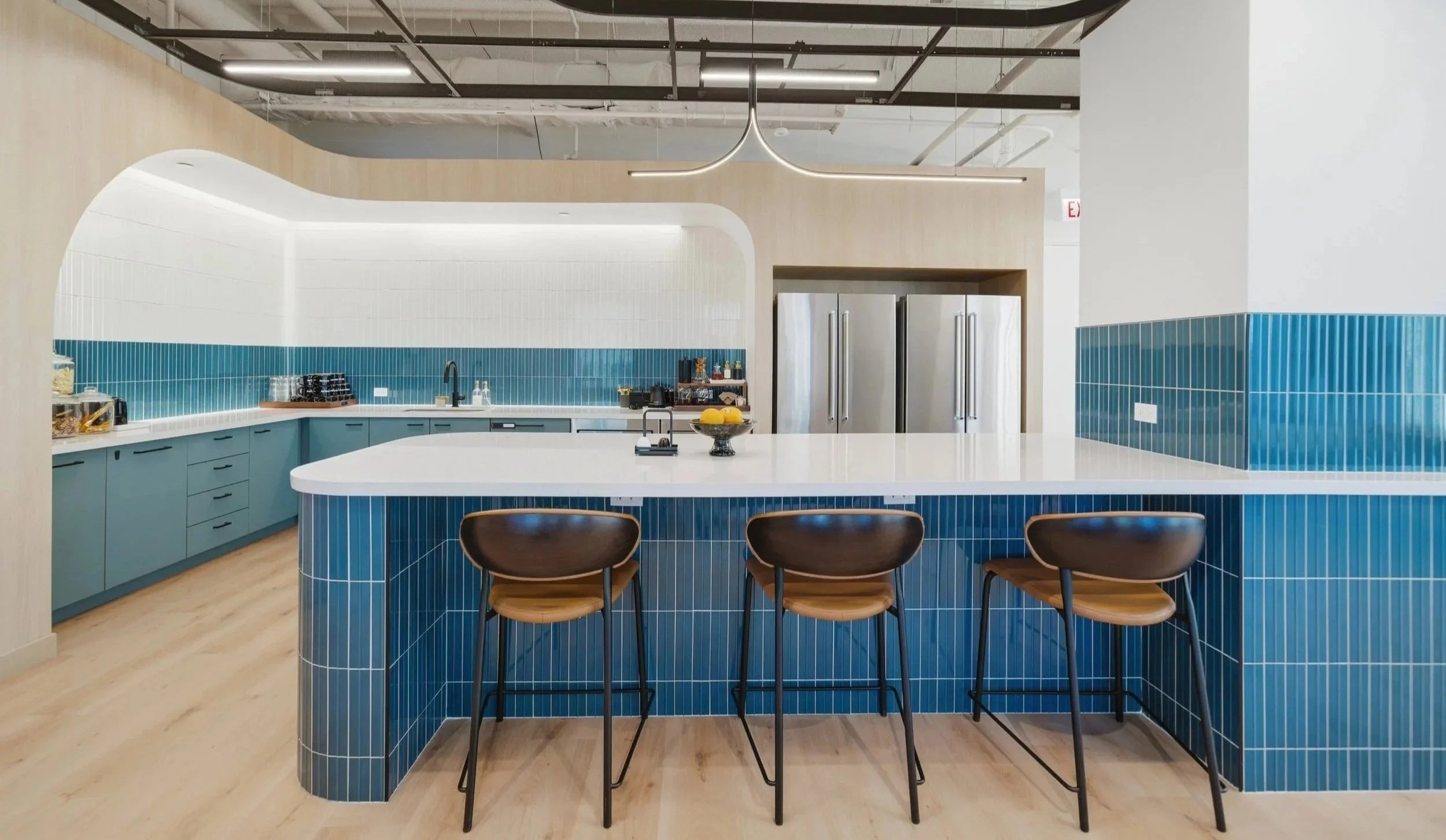 Aeropay’s new headquarters is a bright, open, and inviting space, thoughtfully designed to resemble the needs of modern offices. Light woods, crisp whites, and turquoise accents create a calm, modern backdrop, while windows showcase panoramic views of the Chicago skyline. Collaborative lounges, meeting rooms, and kitchen and coffee bar make the space as functional as it is welcoming, with subtle brand touches like a detailed metal entryway inspired by Aeropay’s logo.